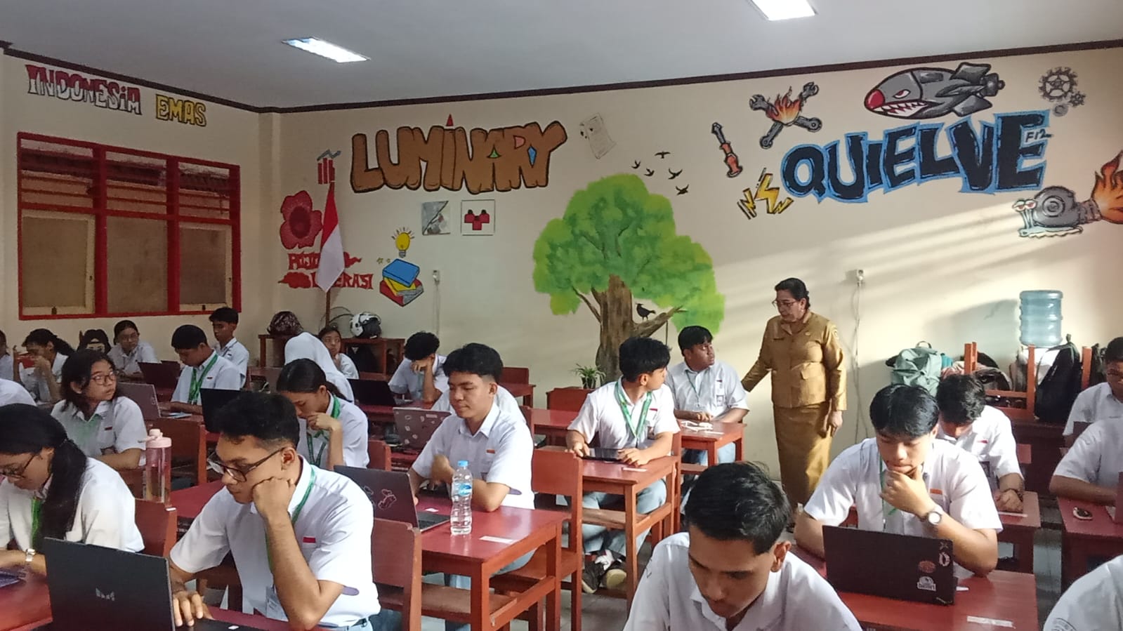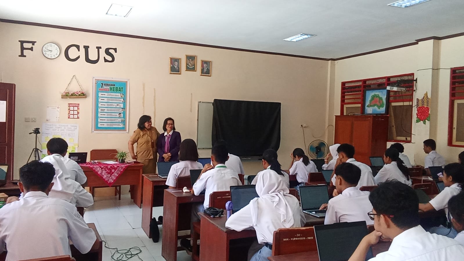 Sebelum ujian dimulai, para siswa terlebih dahulu diberikan arahan di aula sekolah untuk memastikan kesiapan dan ketertiban selama pelaksanaan. Selain itu, kegiatan ujian diawali dengan menonton bersama sambutan Kepala Dinas Pendidikan Kota Ambon melalui papan interaktif digital sebagai bentuk motivasi dan penguatan semangat bagi para siswa.