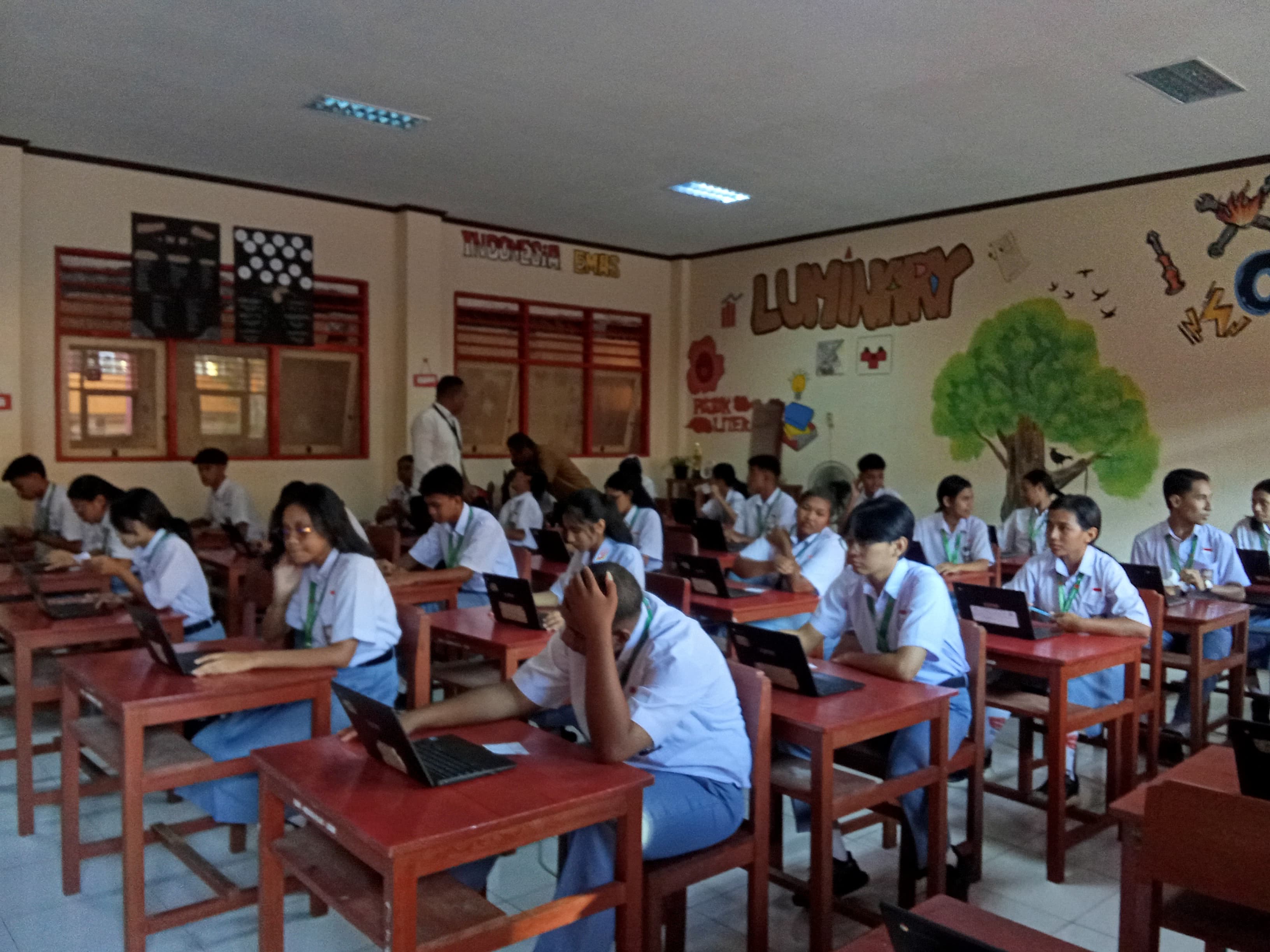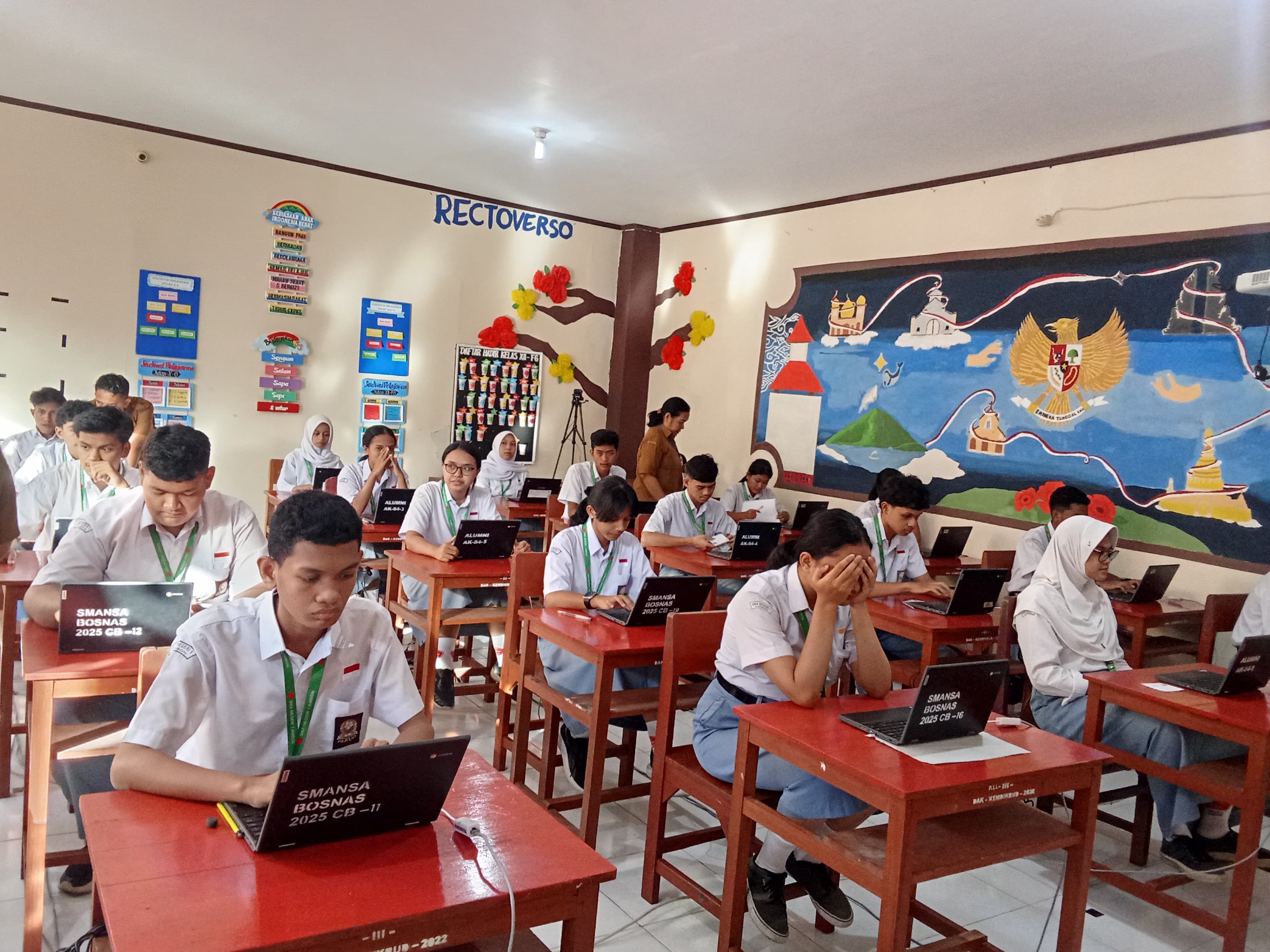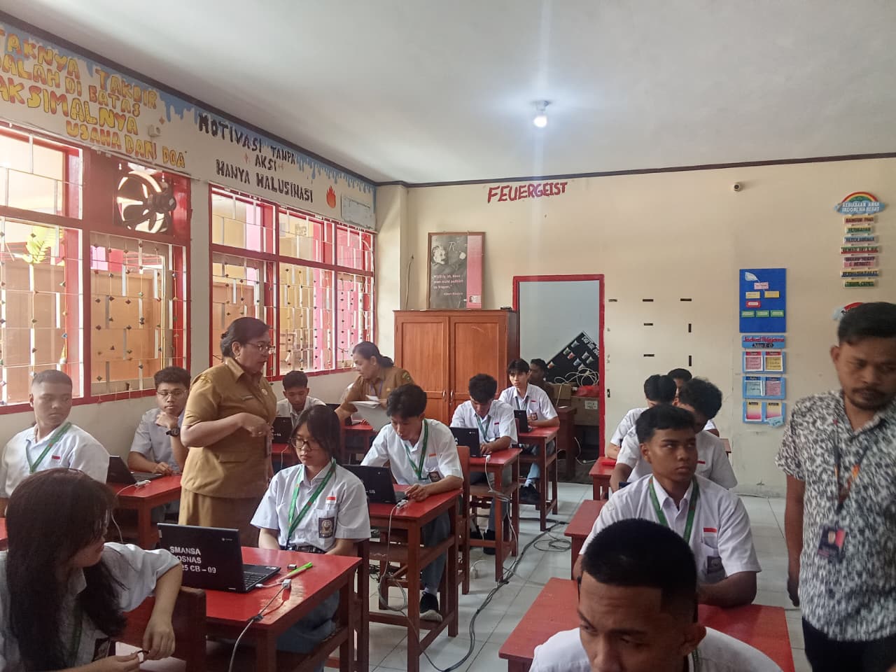Dari sesi pertama hingga sesi ketiga, Kepala Sekolah, Ibu Dra. E. Laturiuw, M.Si, terus hadir memberikan arahan kepada seluruh peserta agar serius dan fokus dalam mengerjakan setiap soal. Beliau juga memberikan motivasi agar para siswa tetap bersemangat, tidak mudah menyerah, serta menjadikan ujian ini sebagai kesempatan untuk menunjukkan kemampuan terbaik mereka.